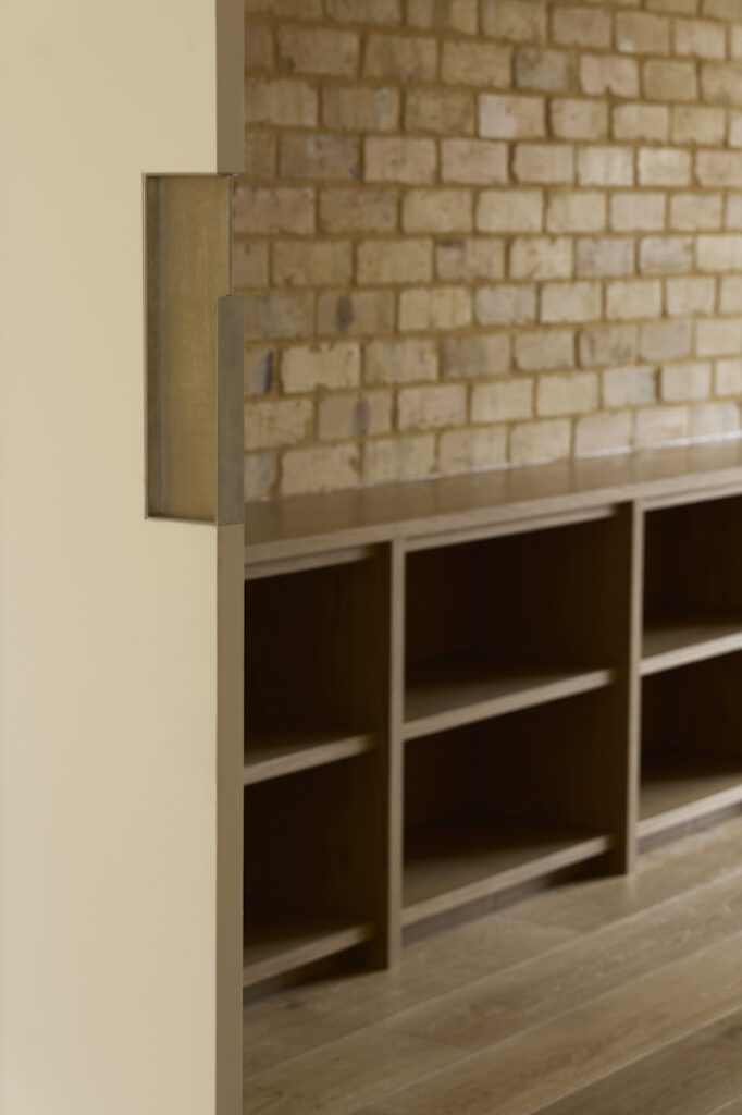 Detail of custom oak joinery integrated with reused internal brickwork wall in Fitzroy Passivhaus home.