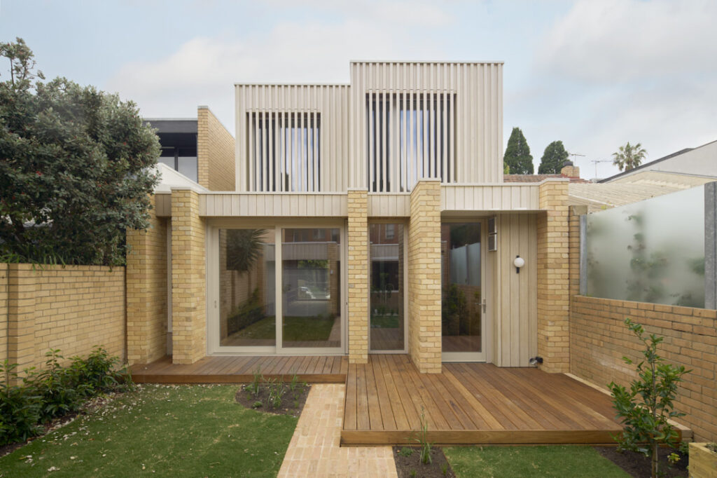 Narrow brick-lined entry path leading to Fitzroy Passivhaus front door.